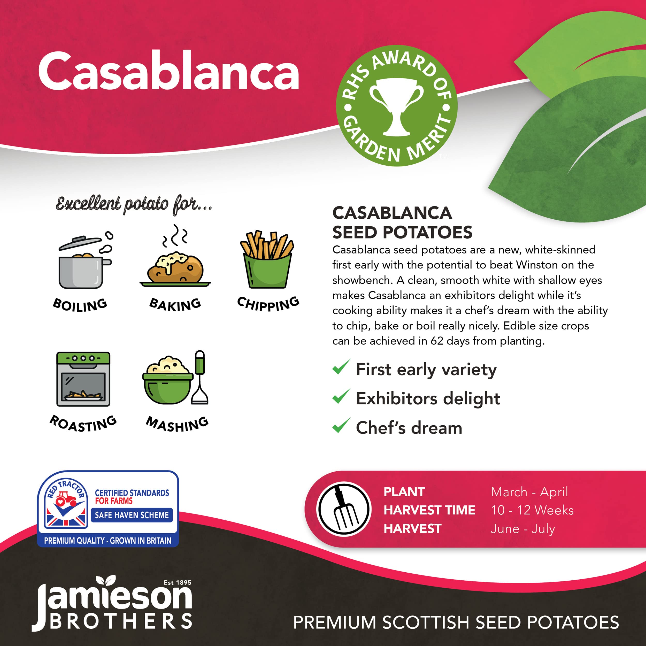 Casablanca seed potatoes are a new, white skinned first early potato, with the potential to beat Winston on the showbench. A clean, smooth white, with shallow eyes, the Casablanca is an exhibitors delight with great cooking ability. Chip, bake, boil, mash or roast it, it really is a chef's dream.