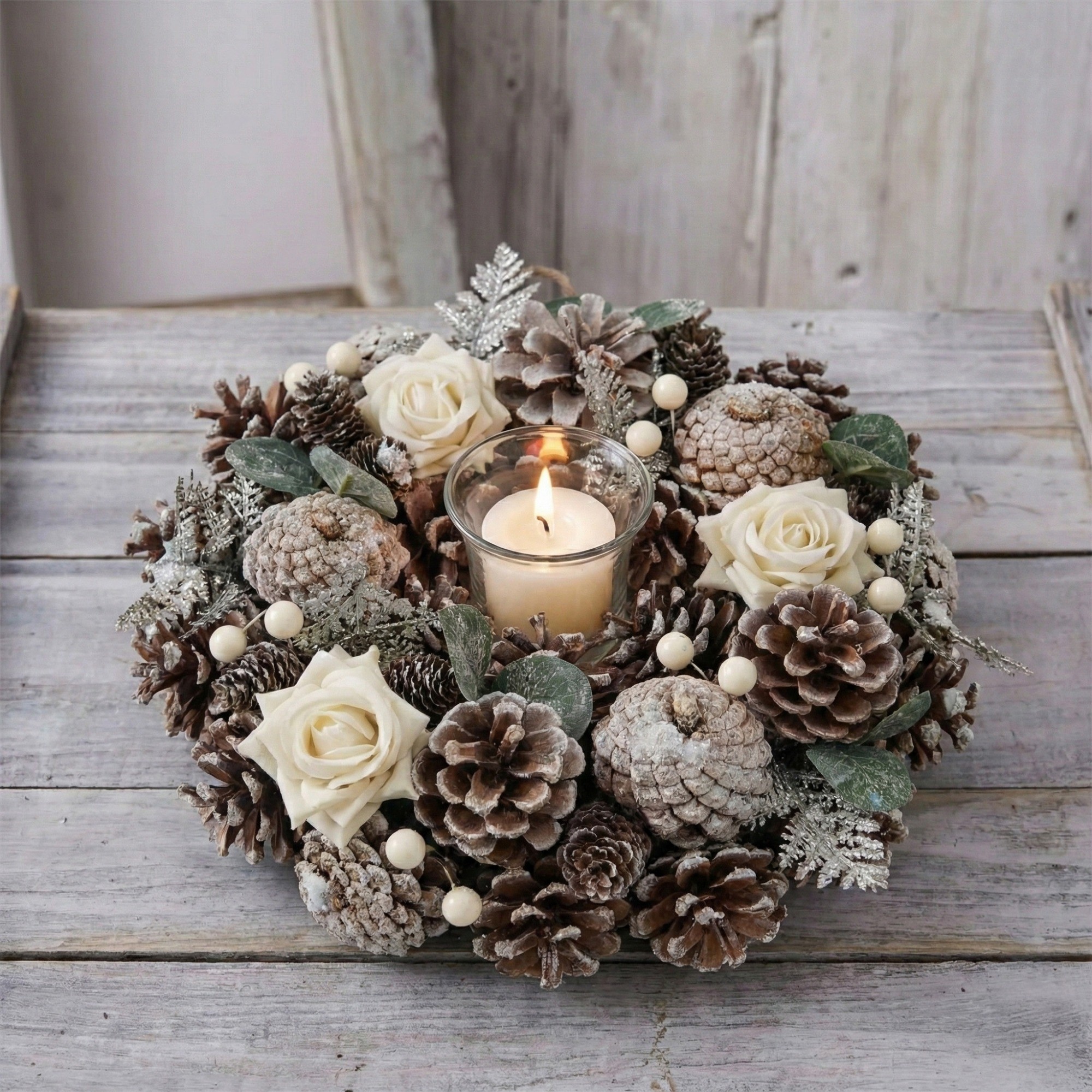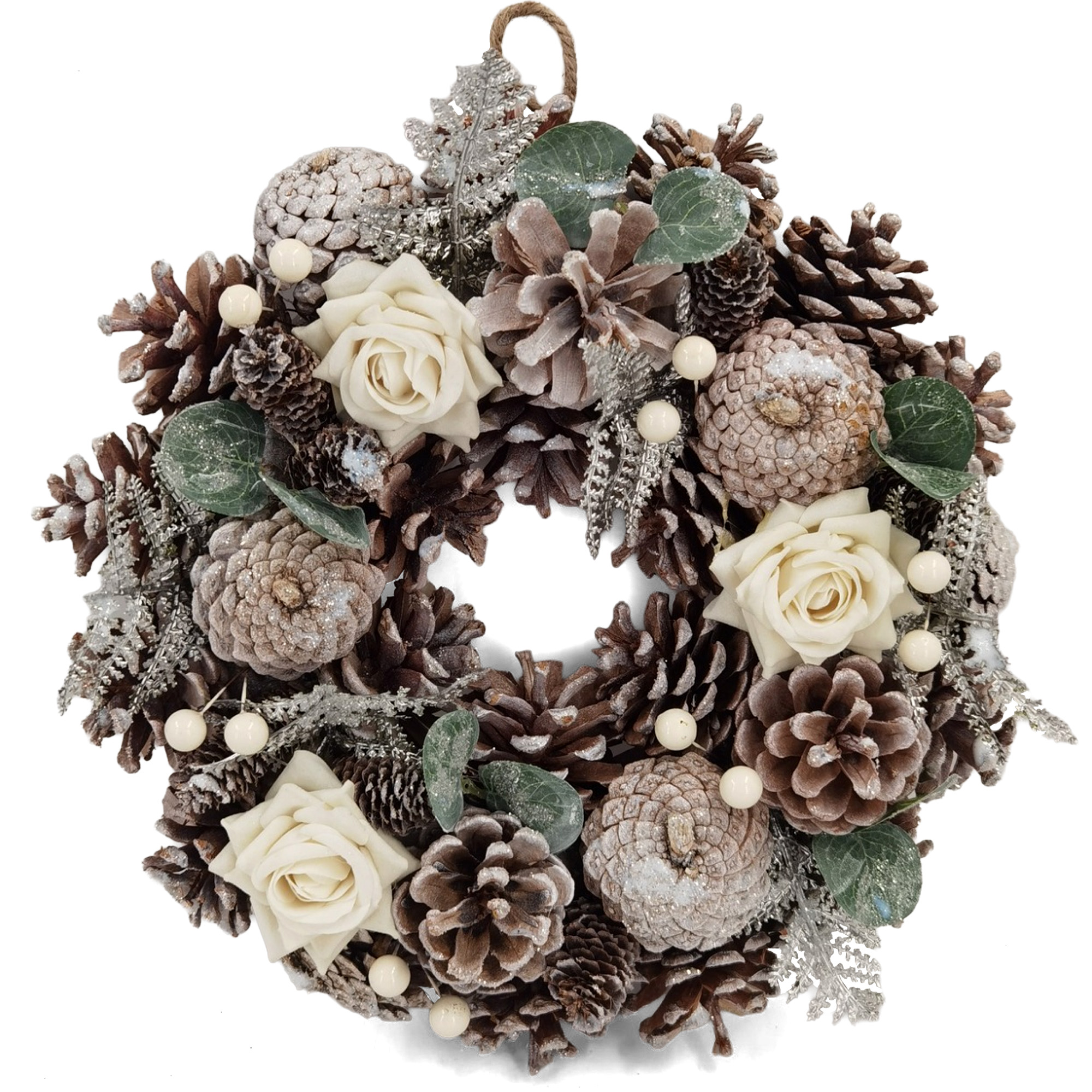 Natural ID 30cm Christmas Wreath for Front Door or Table Centre Realistic White Frosted Xmas Wreath with Xmas Baubles, Flowers, Berries and Pine Cones for Indoor & Outdoor Christmas Decor Home Decoration