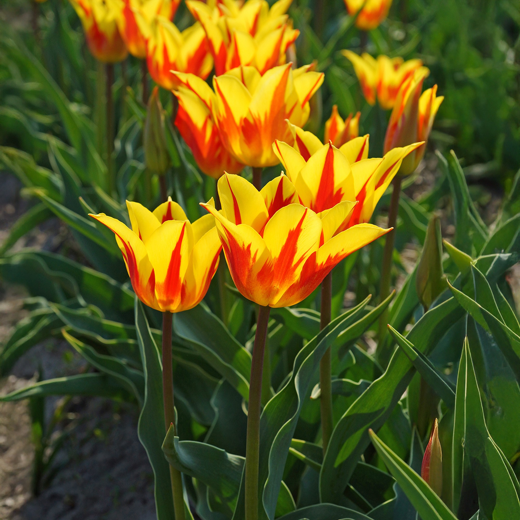 In mid to late spring, expect upright stems topped with vivid yellow flowers boldly streaked in red. Their striking, flame-like appearance makes them ideal for dramatic planting combinations and eye-catching garden displays.