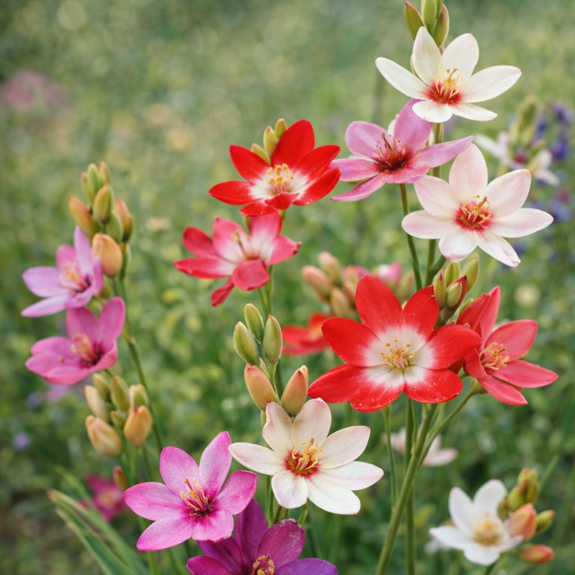 The Ixia Mix, also known as Wand Flower or African Corn Lily, produces tall spikes of star-like blooms in shades of pink, yellow, and white, often featuring contrasting center eyes. These bulbs, grown by top Dutch and British growers to the highest standards and packed in Scotland by Jamieson Brothers, thrive in hot, sunny spots with well-drained soil. Ideal for adding real color to borders, beds, pots, and containers, Ixias are versatile and excellent as long-lasting cut flowers for indoor arrangements. They are perennial in zones 8-10 and can be grown as annuals or lifted in colder zones.