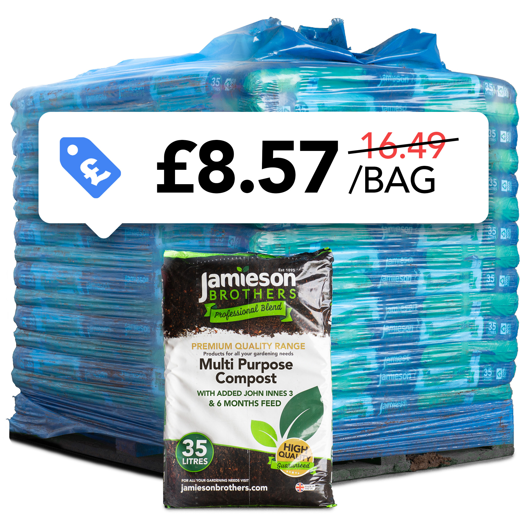 This pallet includes 70 x 35L bags of Multi Purpose Compost with John Innes No. 3, a nutrient-rich mix formulated for mature plants, trees, shrubs, and climbers.