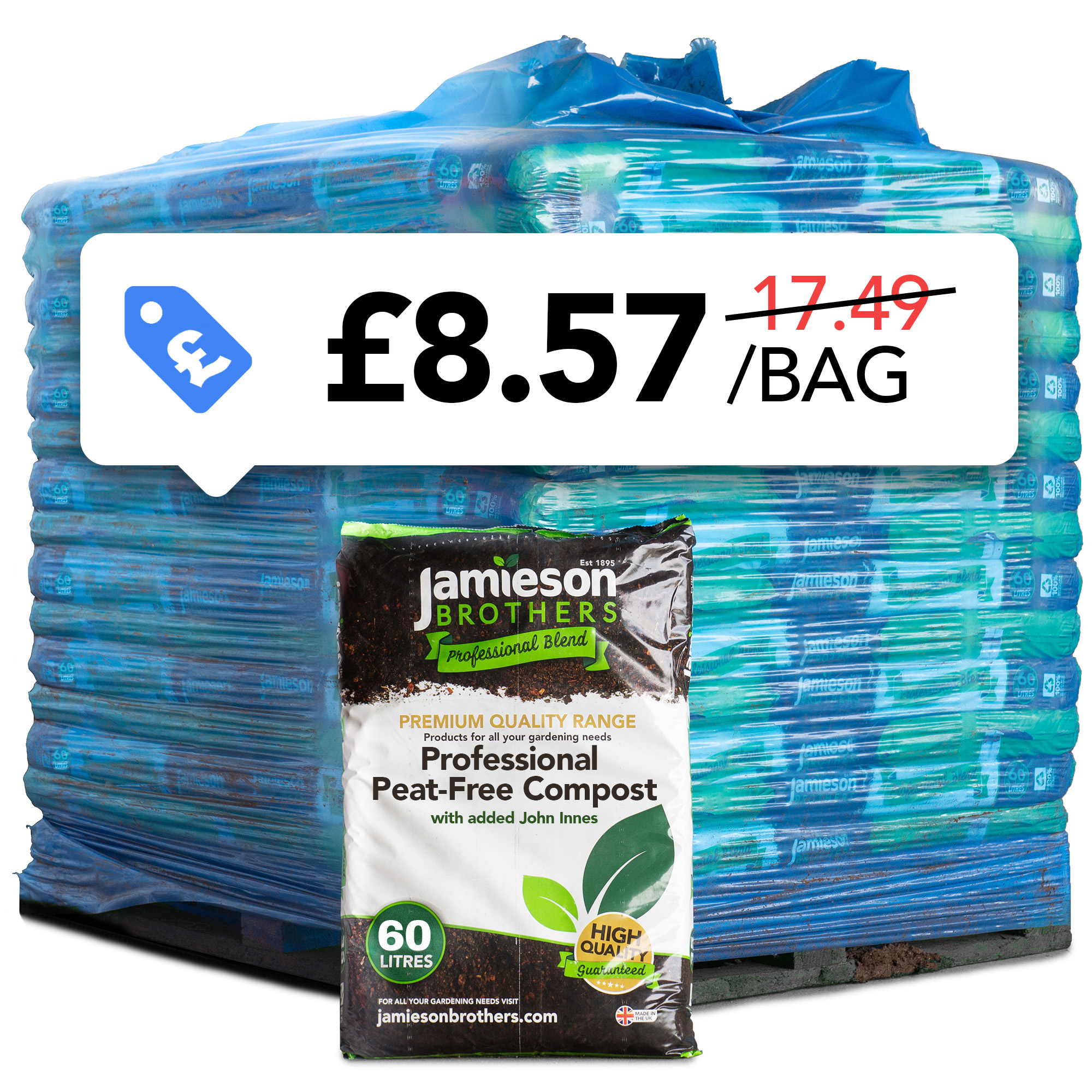 Jamieson Brothers Professional Peat Free Compost with added John Innes – Pallet of 70 x 60L Bags – Kerbside Delivery Only