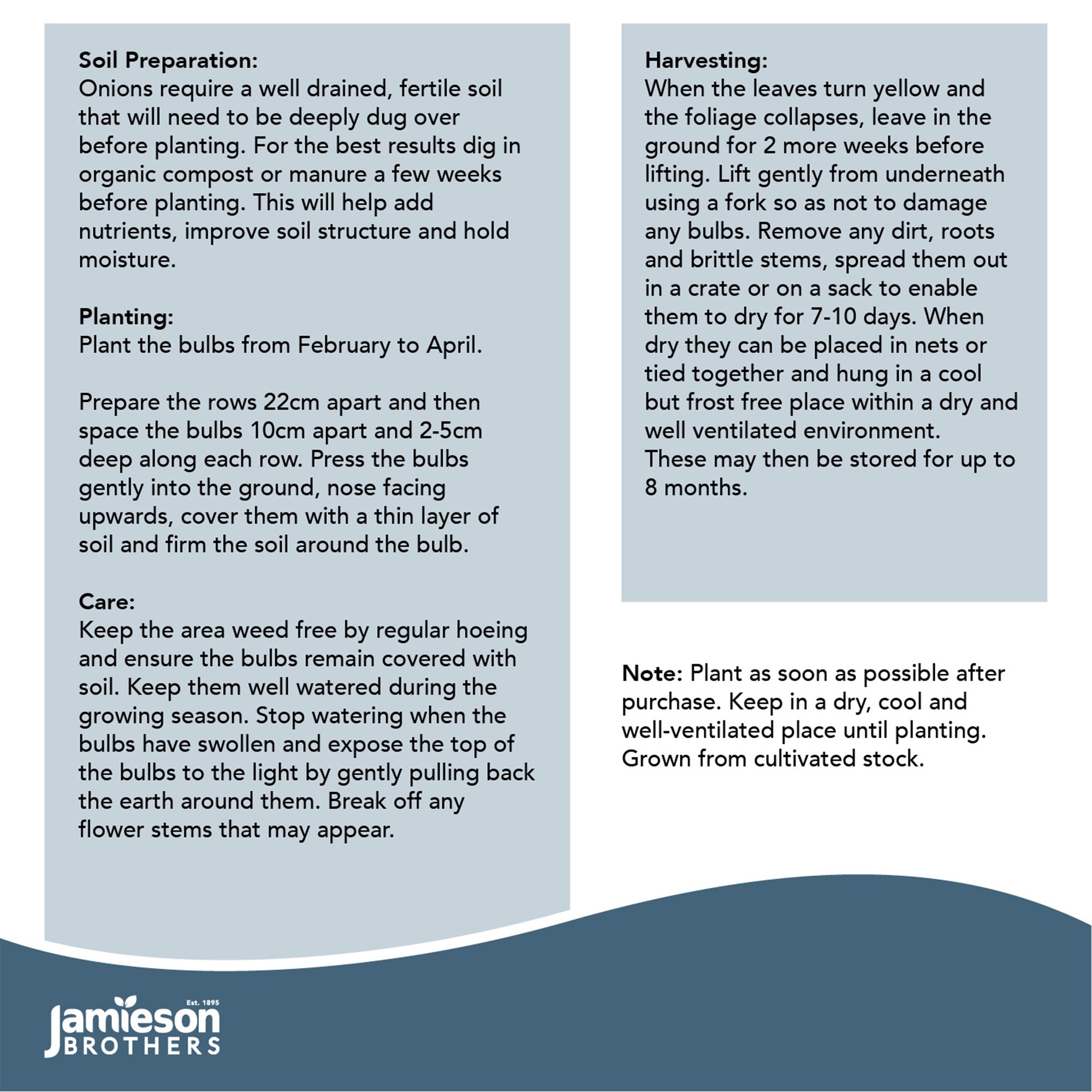 Onions require a well drained, fertile soil that will need to be deeply dug over before planting. For the best results dig in organic compost or manure a few weeks before planting. This will help add nutrients, improve soil structure and hold moisture.