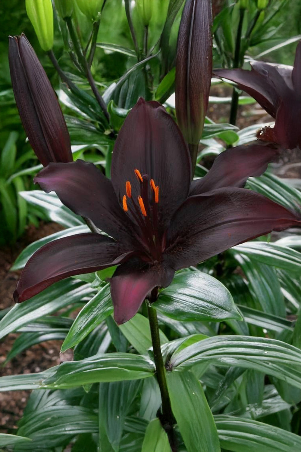 Lilium Asiatic 'Black' (Lilium asiaticum 'Black') is a dramatic and eye-catching lily variety, featuring deep maroon-black blooms that appear almost velvet-like in texture. Flowering in early to mid-summer, this bold lily adds striking contrast and sophistication to borders, containers, and floral arrangements. Its upright habit and strong stems make it ideal for both garden impact and cutting.