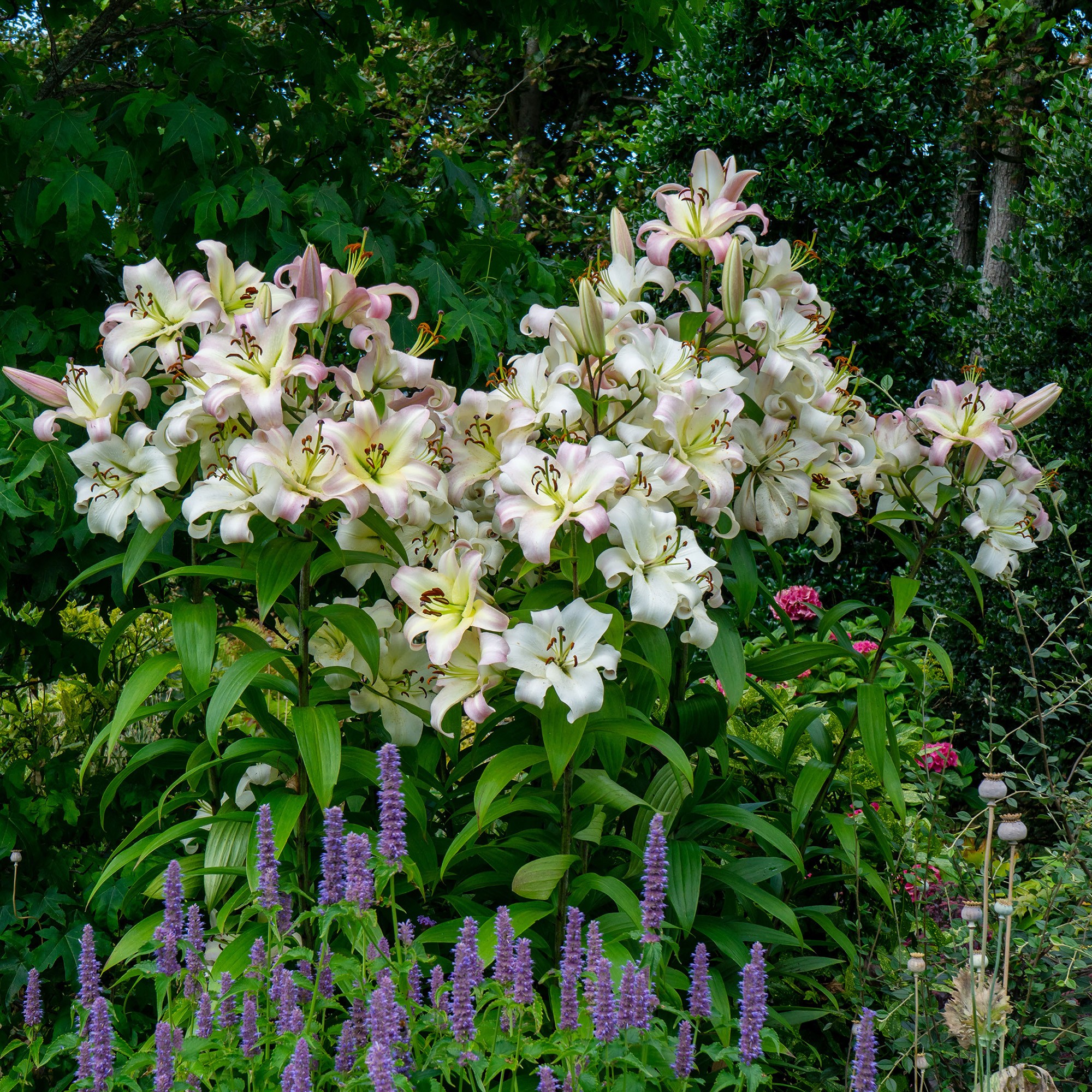 Introducing the magnificent Lilium 'Pretty Woman', an Orienpet or "Tree Lily" variety known for its statuesque height (36 to 96 inches) and outfacing, pure white, fragrant flowers. This elegant hybrid, a cross between Oriental and Trumpet Lilies, adds magnificent color and height to mid to late summer gardens, performing well in full sun to partial shade. The bulbs are grown by top Dutch and British growers to the highest standards and packed in Scotland by Jamieson Brothers.