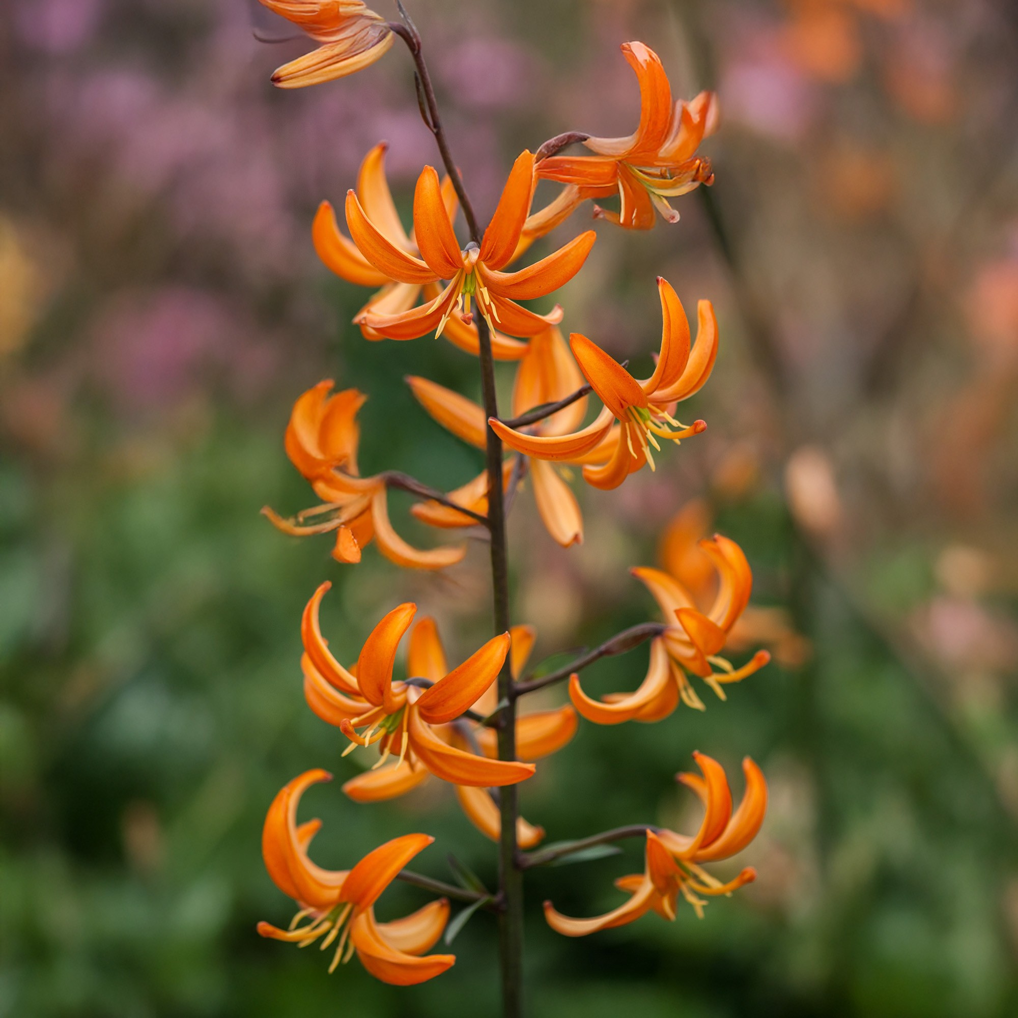 Lilium Martagon ‘Must See’ is a striking variety of Martagon lily, known for its gracefully reflexed petals in rich orange & white shades flecked with darker spots. Its tall, elegant stems and nodding blooms make it a beautiful addition to shaded borders and natural-style planting schemes.