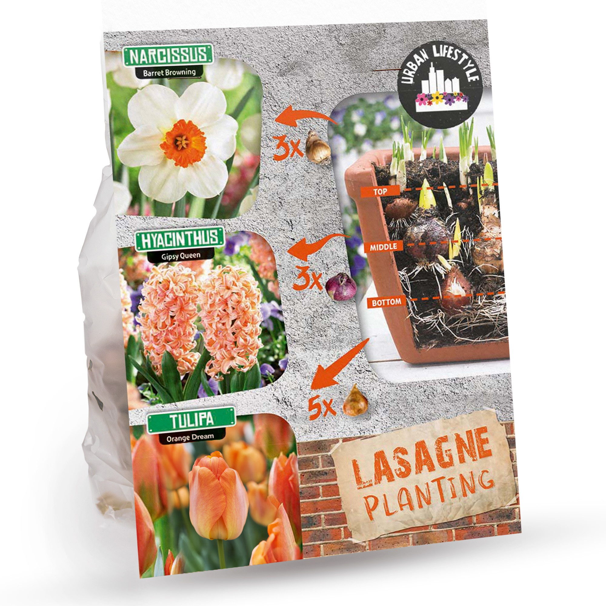 Orange Lasagne Mix is a beautifully layered bulb selection designed to bloom in harmonious waves of orange, peach, and soft white. Combining the sweetly scented Hyacinthus Gipsy Queen, the graceful Daffodil Barrett Browning, and the bold Tulip Orange Dream, this trio offers a long-lasting, tiered display of colour and form from early to mid-spring.