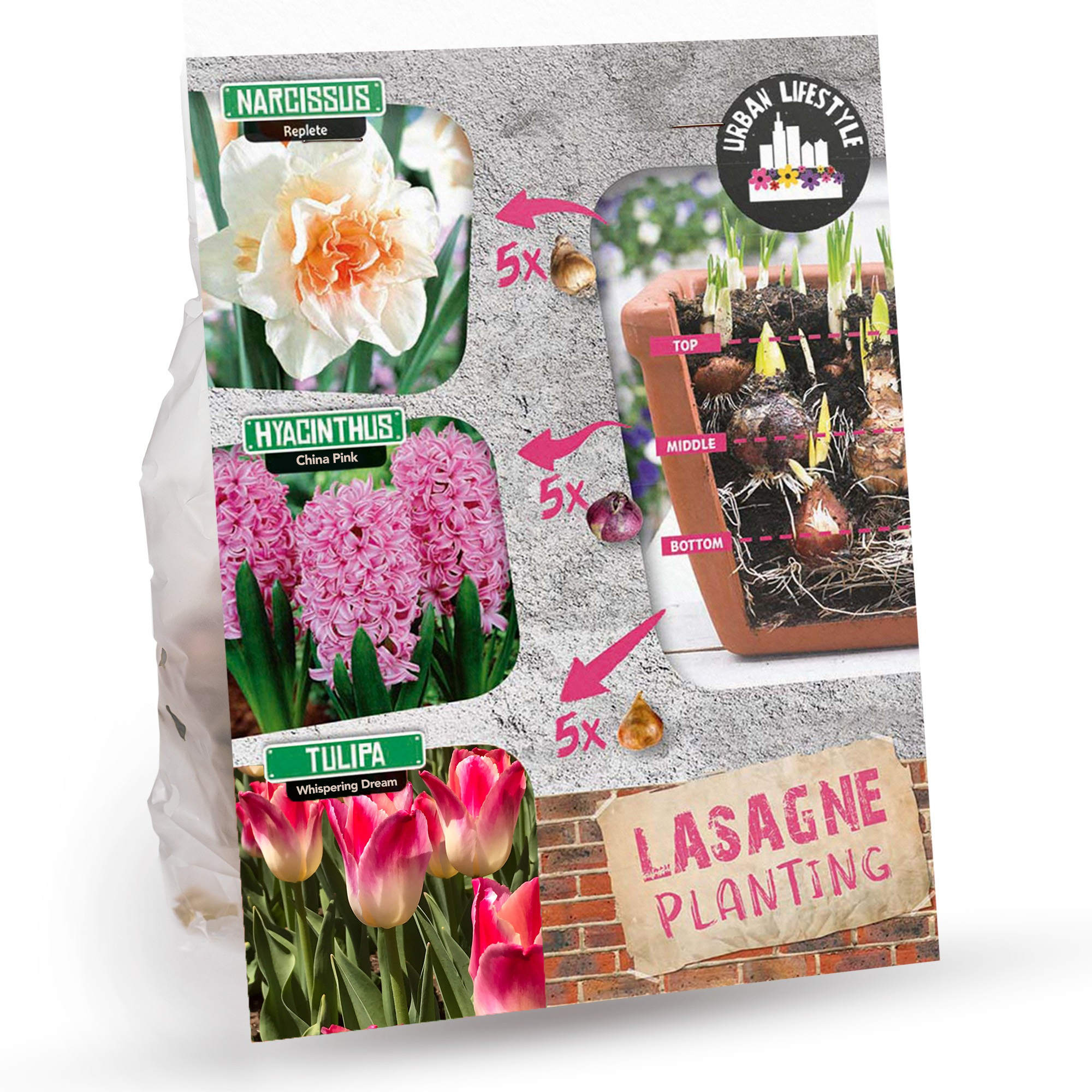 Pink Lasagne Mix: Daffodil Replete, Hyacinthus China Pink, Tulip Whispering Dream - 15 Bulbs Ready for Planting Now in UK Autumn Outdoor Gardens