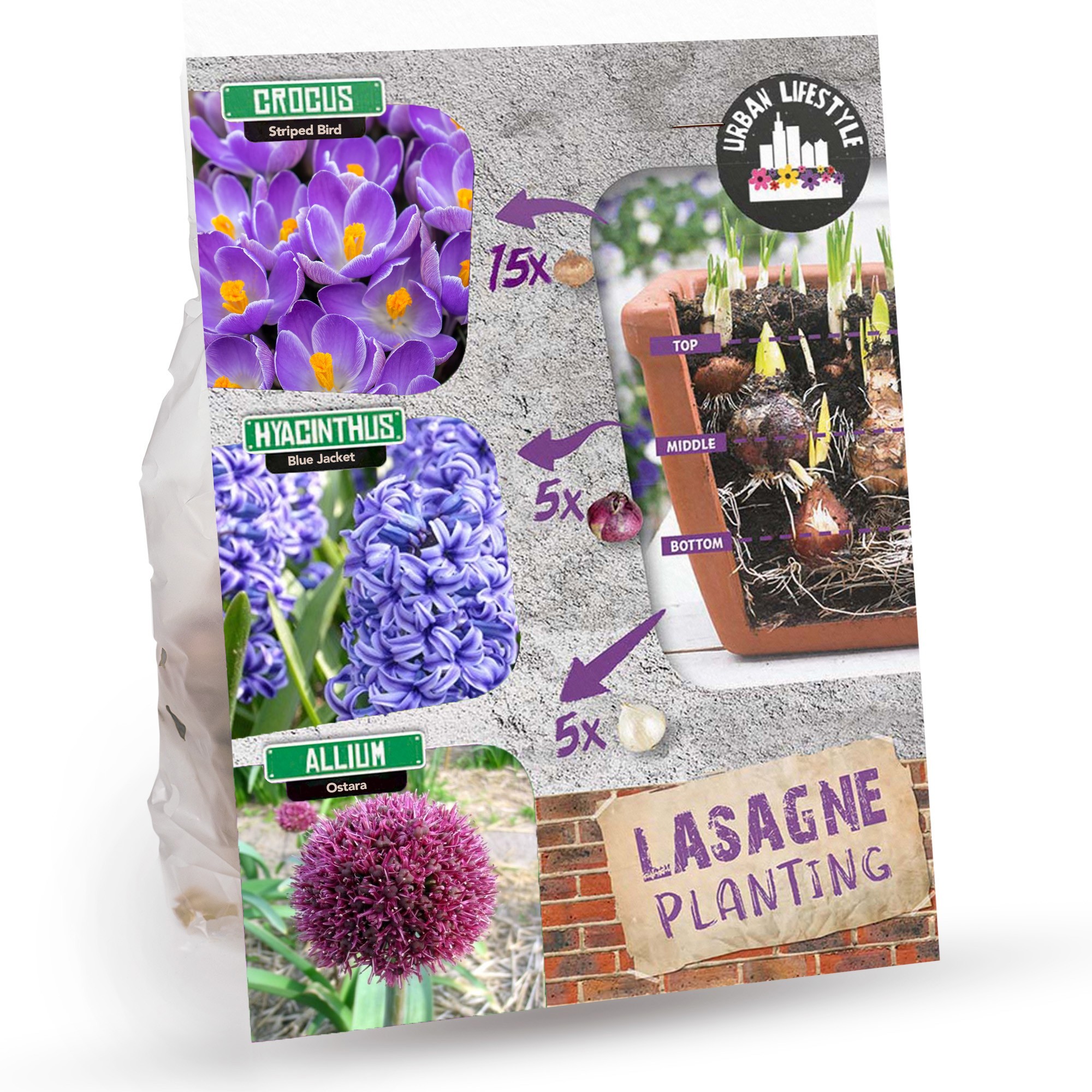 Purple Lasagne Mix brings a regal display of purples to your garden in perfectly timed layers. Crocus Striped Bird provides a bright start, followed by fragrant Hyacinthus Blue Jacket, and finished with tall, architectural Allium Ostara for late spring drama.