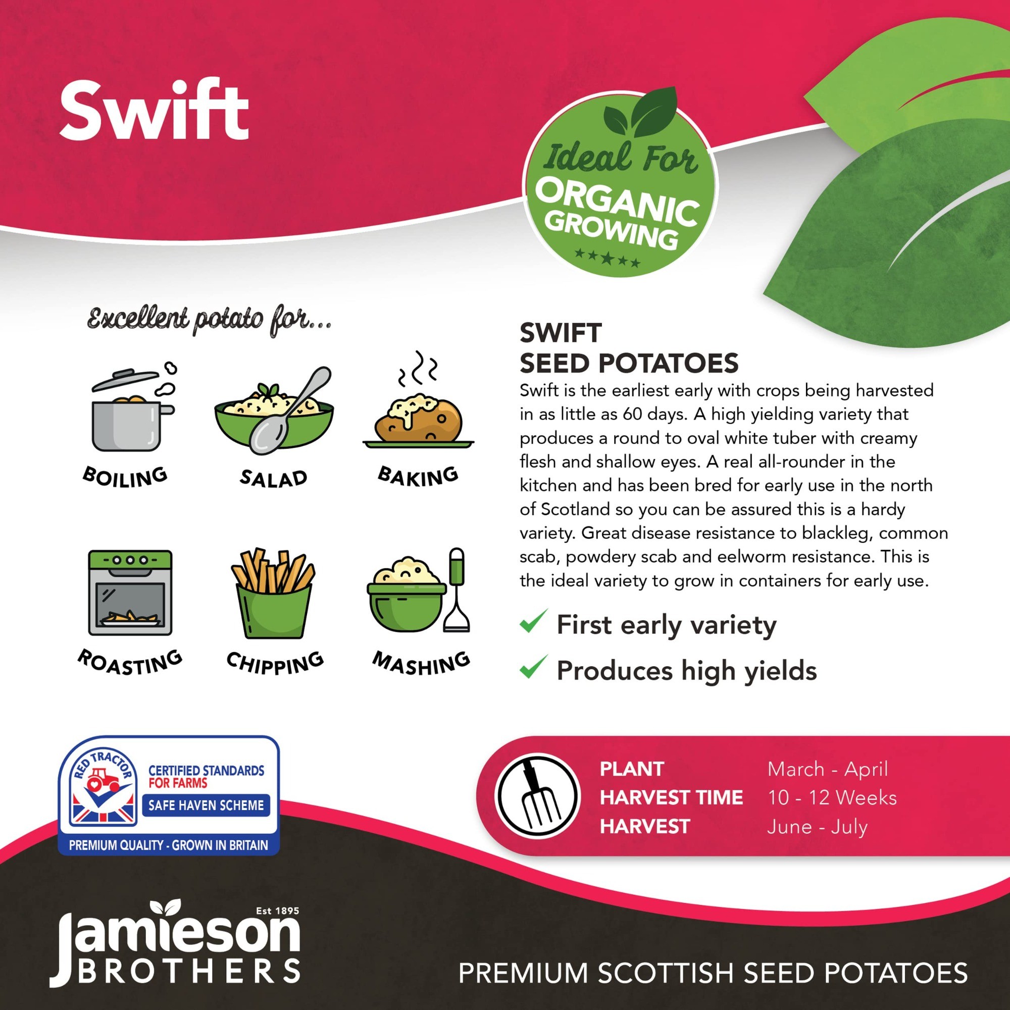 Great disease resistance to blackleg, common scab, powdery-scab and eelworm. Swift is an ideal variety to grow in containers for early use.