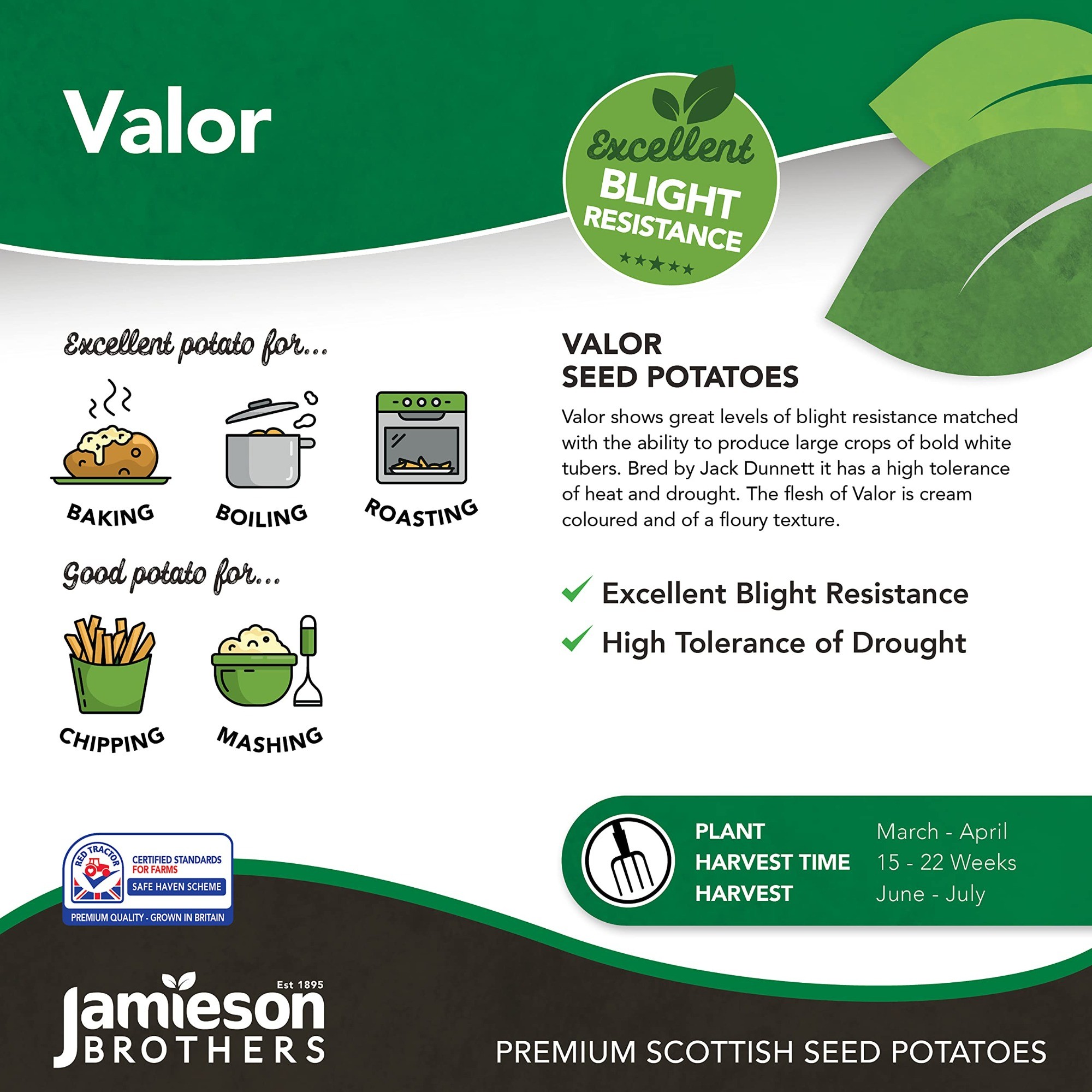 Bred by Jack Dunnett, Valor has a high tolerance of heat and drought whilst their flesh is cream coloured and of a floury texture.